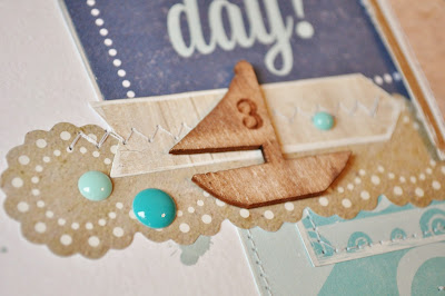 There are a few obvious differences; I only used one photo and have two rows of squares instead of three, but I was really inspired by their sketch. I kept the stitched lines, the basic grid concept, and the title's in the same spot. I've had this photo since last September and wanted to make sure it ended up on a pretty page since it's me with my favorite three (soon to be four) year old. The paper is Maggie Holmes' 'Flea Market' line. I love the pink, mint, and gold together.| Banner Detail |